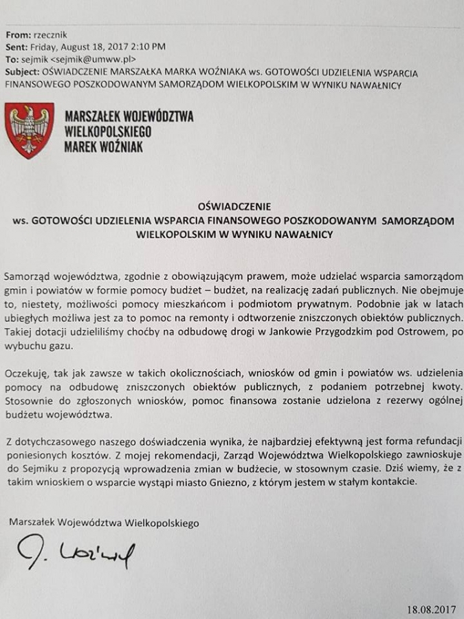 OŚWIADCZENIE MARSZAŁKA MARKA WOŹNIAKA ws. GOTOWOŚCI UDZIELENIA WSPARCIA FINANSOWEGO POSZKODOWANYM SAMORZĄDOM WIELKOPOLSKIM W WYNIKU NAWAŁNIC.